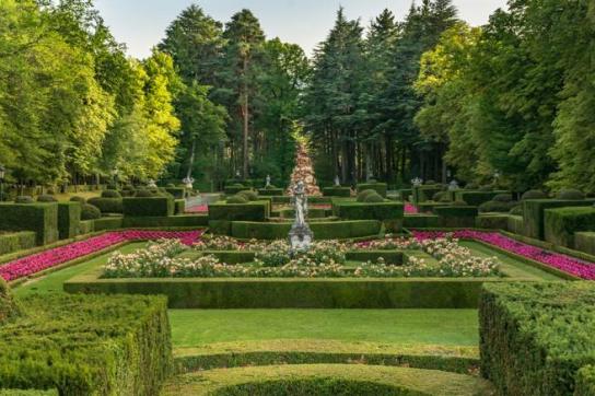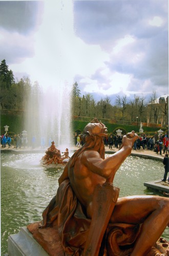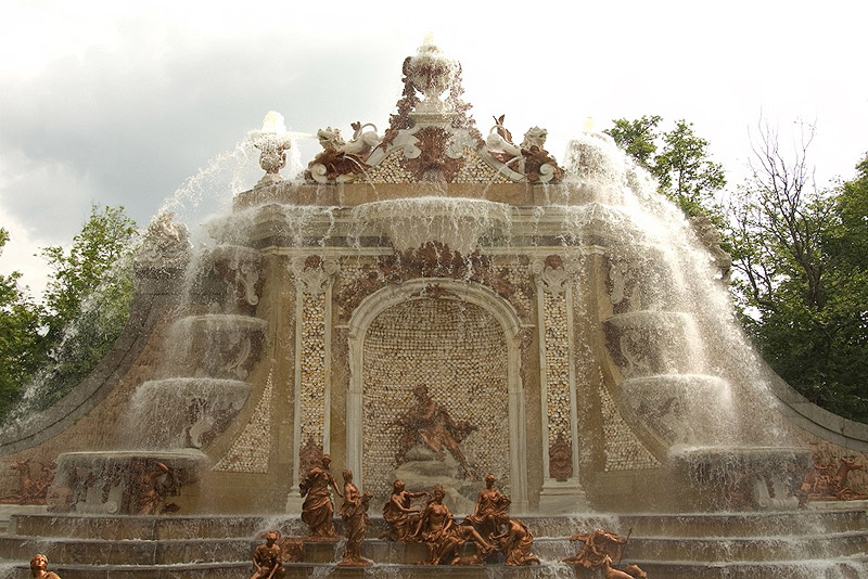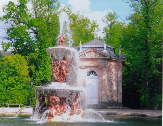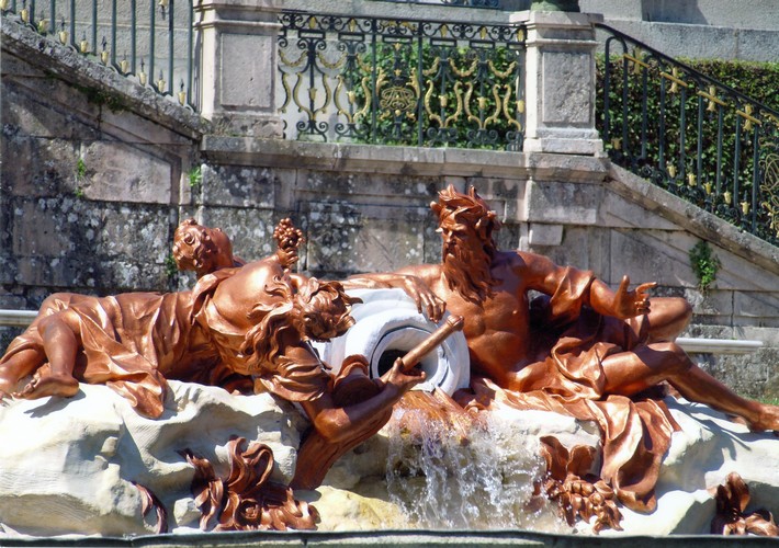 Las fuentes, inspiradas en la mitología clásica, presentan deidades, alegorías y escenas mitológicas. Fabricadas en plomo para evitar la corrosión, fueron pintadas para parecer bronce y otorgarles un aspecto noble, similar a las de Versalles.
