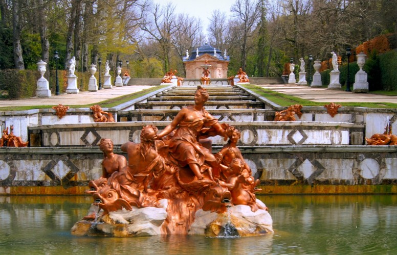 Indudablemente, constituye la parte más reconocida del Palacio de Segovia. La provisión de agua para todo el sistema proviene de los arroyos Morete, Carneros y Cacera de Peñalara o Chorranca, que llenan el estanque conocido como «El Mar». Este estanque, ubicado en la cota más alta del jardín con una capacidad de 216,000 m³, suministra la mayor parte del sistema. Además, para alimentar las diversas fuentes, existen otros ocho estanques y depósitos, como El Chato, El Cuadrado, Las Ranas, El Medio Celemín, Las Llagas, Las Ocho Calles, depósito El Nuevo y depósito de Uso Común, ubicados en diferentes niveles para lograr presiones adecuadas y permitir que las fuentes tengan chorros de alturas diversas sin afectar la presión de las demás.