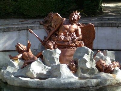 La más grande es la Fuente de Neptuno que está formada por una pila rectangular y tres grupos escultóricos alineados. En el centro está Neptuno con su tridente sobre una carroza tirada por dos caballos con cola de pez (Hipocampos) que expulsan agua por sus narices y en la proa de la carroza un tritón sujeta a un delfín que expulsa un chorro vertical de casi 30 metros de alto. A los lados dos geniecillos montados sobre caballos marinos escoltan a Neptuno. Expulsan un chorro cada uno de menor altura que el central.